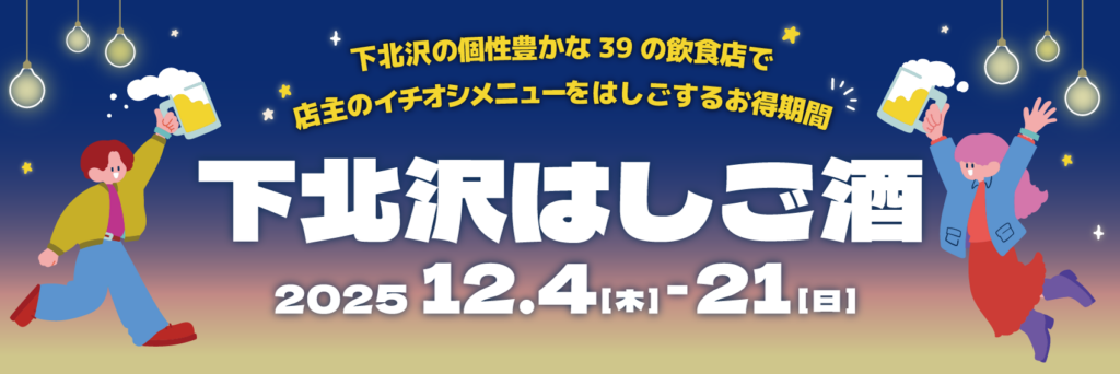 今回のテーマは「店主のイチオシ」です。グルメ激戦区・下北沢の39店舗が“これだけは食べてほしい一皿”をご用意します。リストバンドを提示すると通常よりもお得な価格でお酒と料理を楽しむことができるため、普段なかなか行かないお店にも気軽に立ち寄れるチャンスです。また、​お店を巡るごとに景品がもらえるスタンプラリーも実施いたします。​​ノンアルコールメニューもご用意しているため、お酒が飲めない方もご参加いただけます。気になるお店をはしごしながら、下北沢でしか味わえないおいしい出会いを、ぜひお楽しみください。