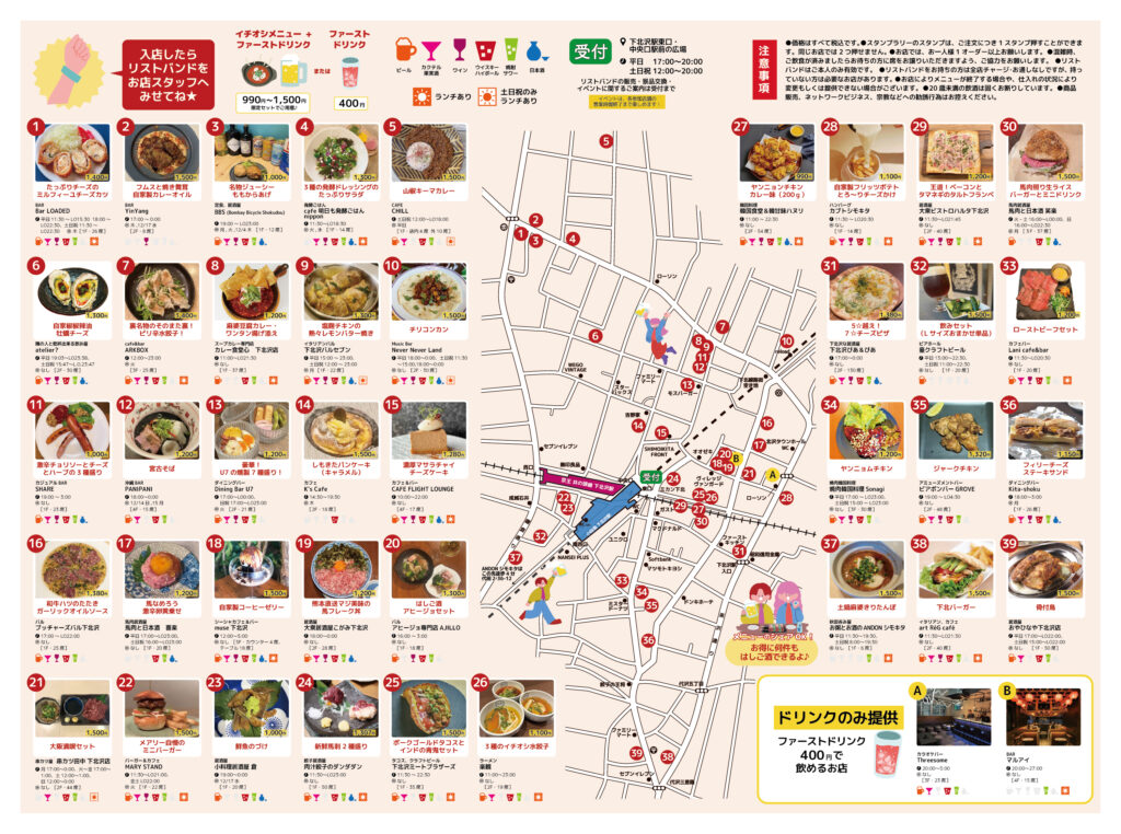 ​​内容​ ​​下北沢の39店舗の飲食店で「イチオシ」を楽しみながらはしご酒するイベントです。リストバンドを提示することで、チャージ・お通しなしで気軽にお店をはしごできます。また、お店を巡るごとに集めることができるスタンプラリーで景品をゲットすることもできます。​